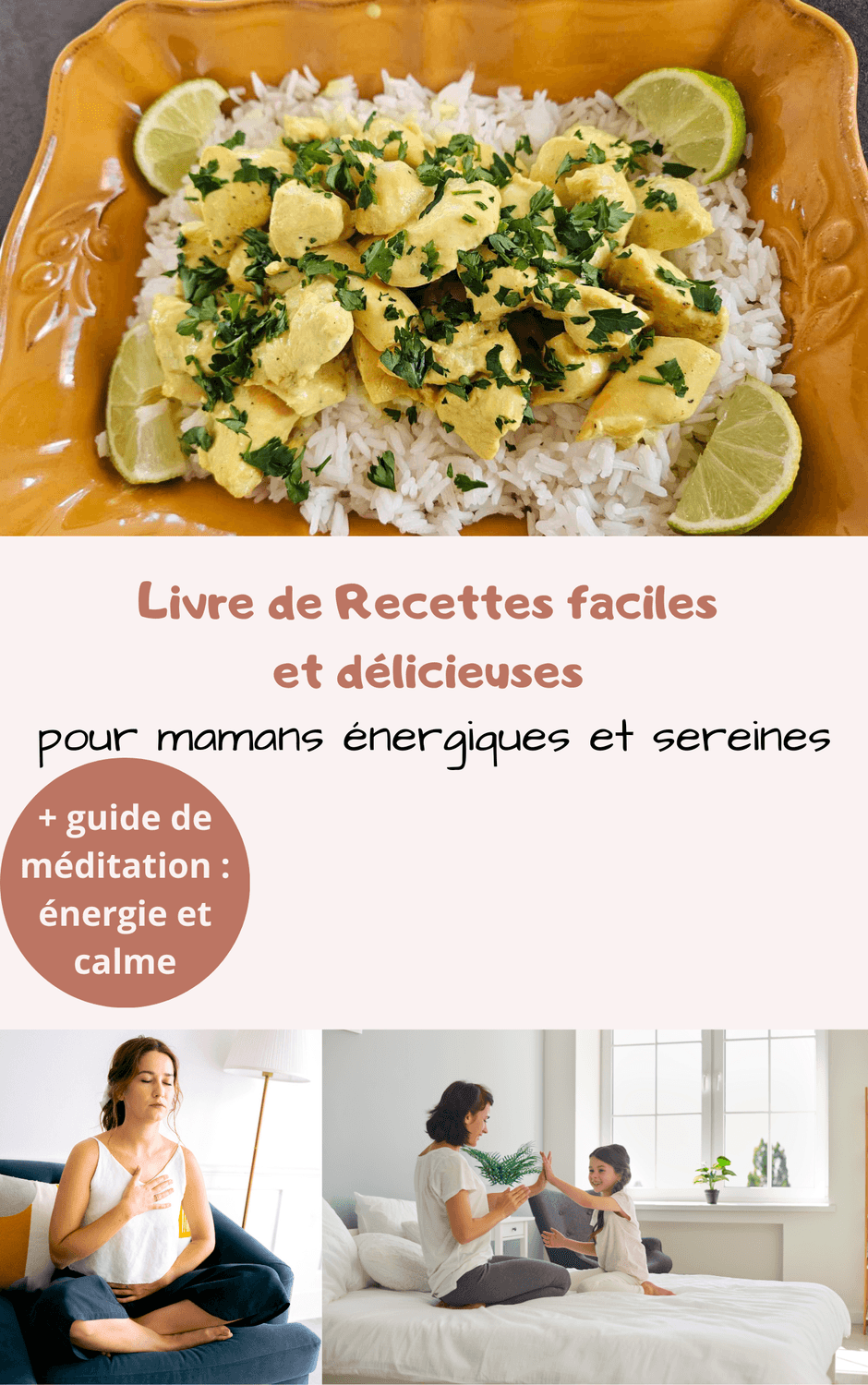 Je te propose mon livre de recettes faciles et délicieuses pour mamans énergiques et sereines incluant des recettes sucrées et salées.